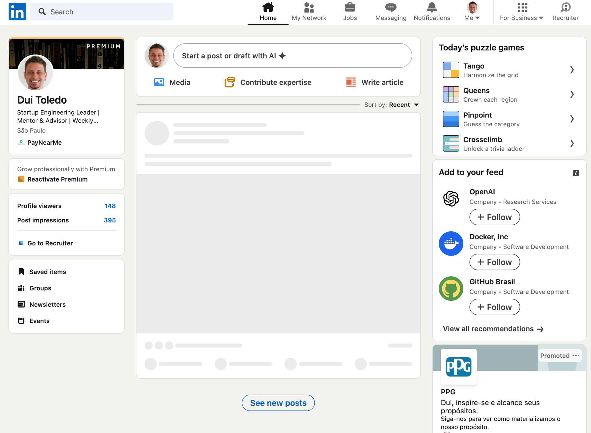 As you can see, even though I don't follow anybody and have no news feed, there's still a bunch of adverts when logged in – companies to follow, games to play. No thanks. Aside from logging in once to schedule my article and sometimes with one or two exceptions for a quick post (or for work reasons, like checking a candidate's profile before an interview), there's no need for me to log in to LinkedIn. I also don't have LinkedIn on any of my phones, of course.