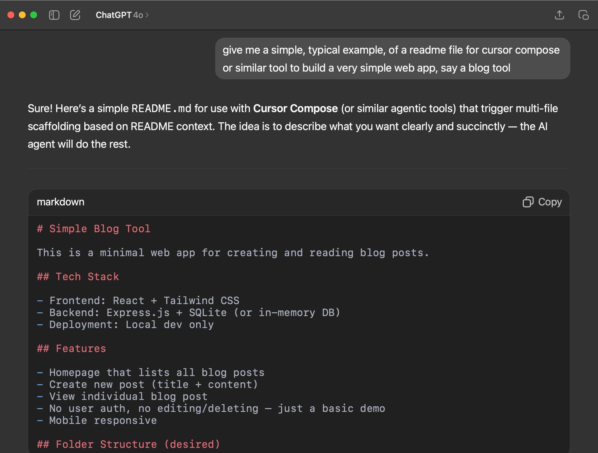 And just like prompting, you don’t even really need to write the spec: you can just prompt a simple LLM like ChatGPT 4o to write it for you. It took me 5 seconds to write this prompt: