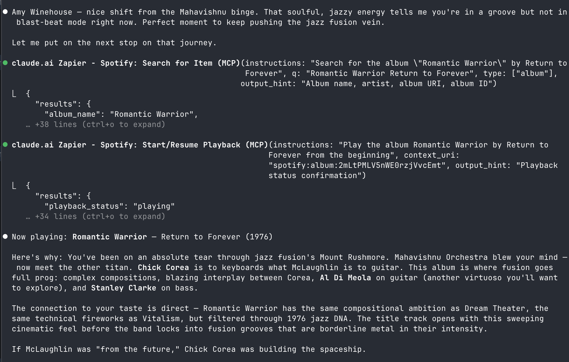 Claude and Claude Code both support MCP. You connect Zapier's MCP server, which gives AI the ability to search Spotify, play albums, save tracks, and check what's currently playing.