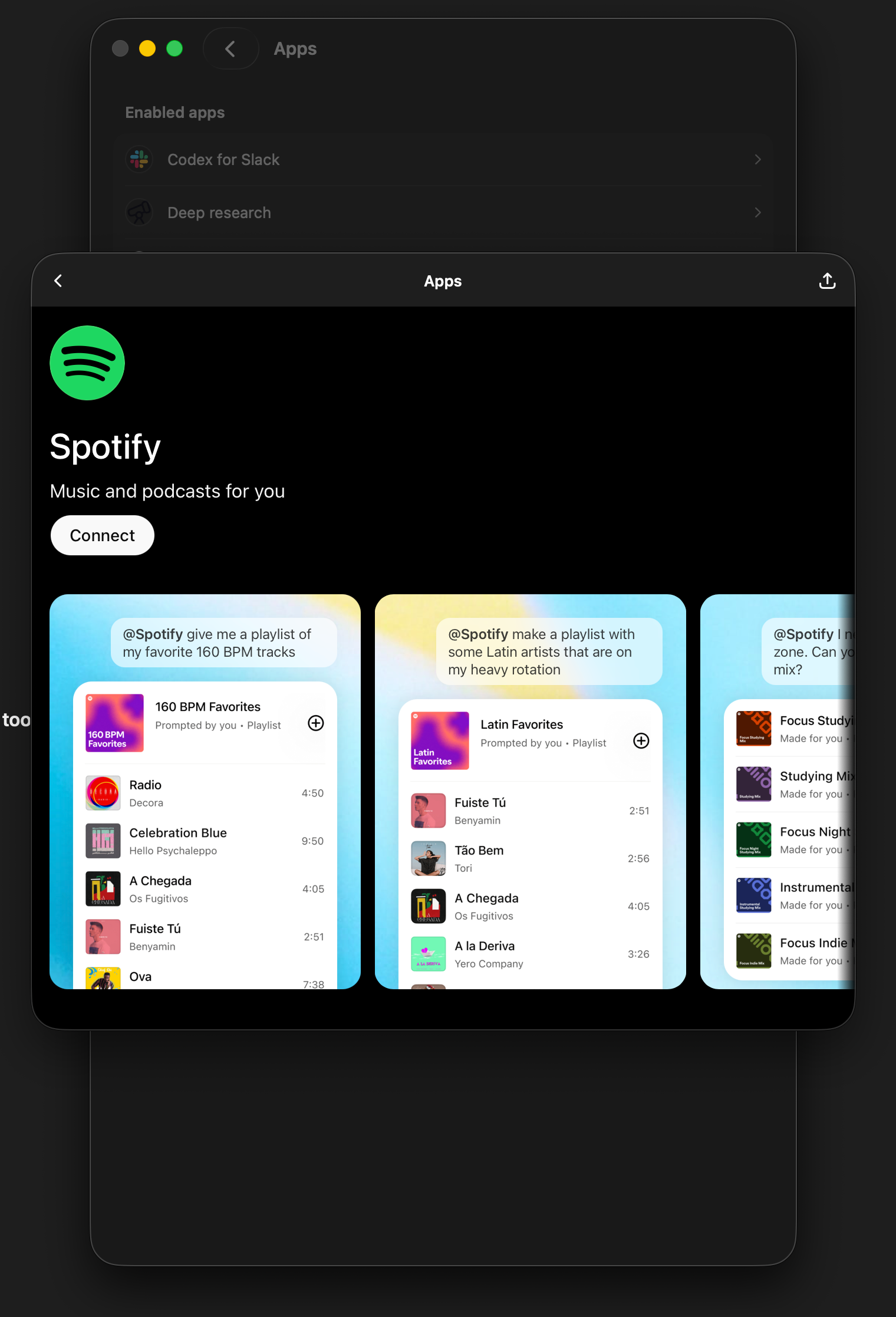 ChatGPT apparently doesn’t support MCP yet, but it has the concept of “Apps” with a Spotify app which I presume does a similar thing (though you won'd be able to do the customizations below unless you keep asking it to save stuff in memory).