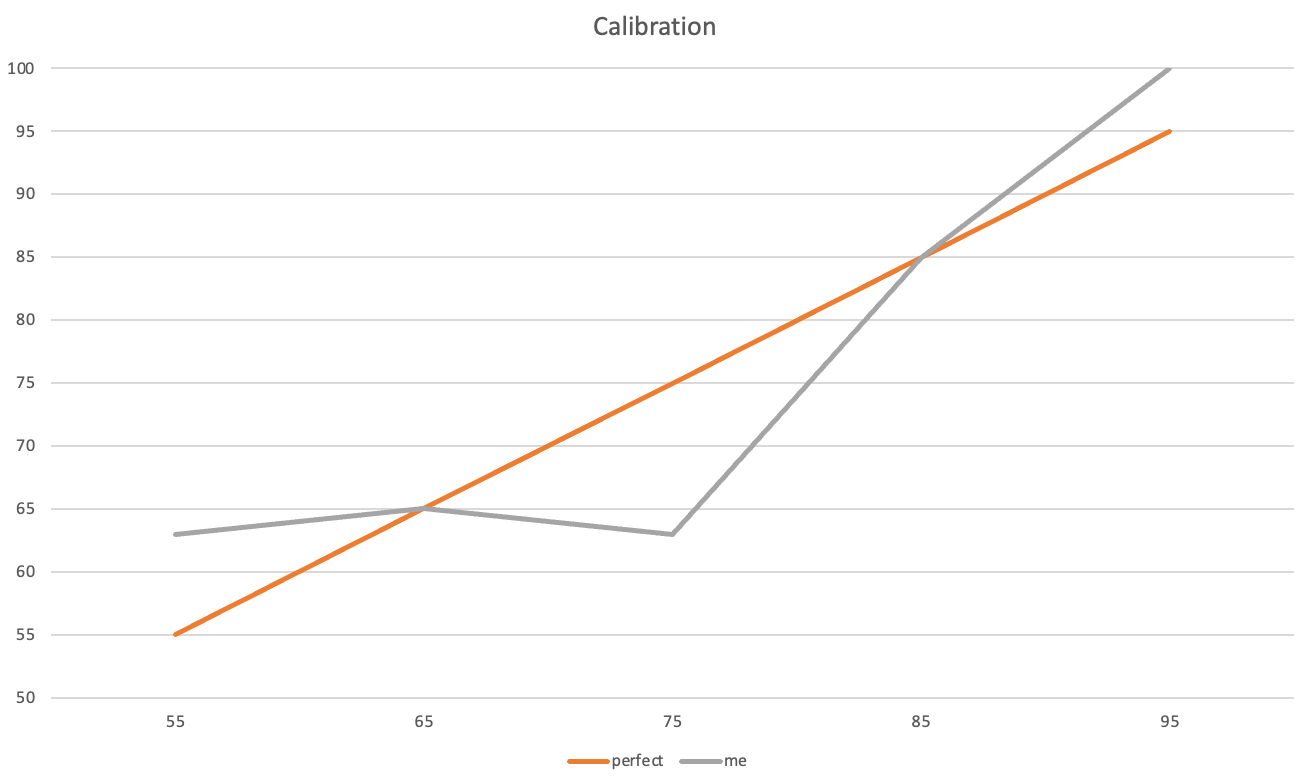 It was a simple example and test, but it's interesting to see that in it I was as likely to be right when I was 55% confident as when I was 75% confident.