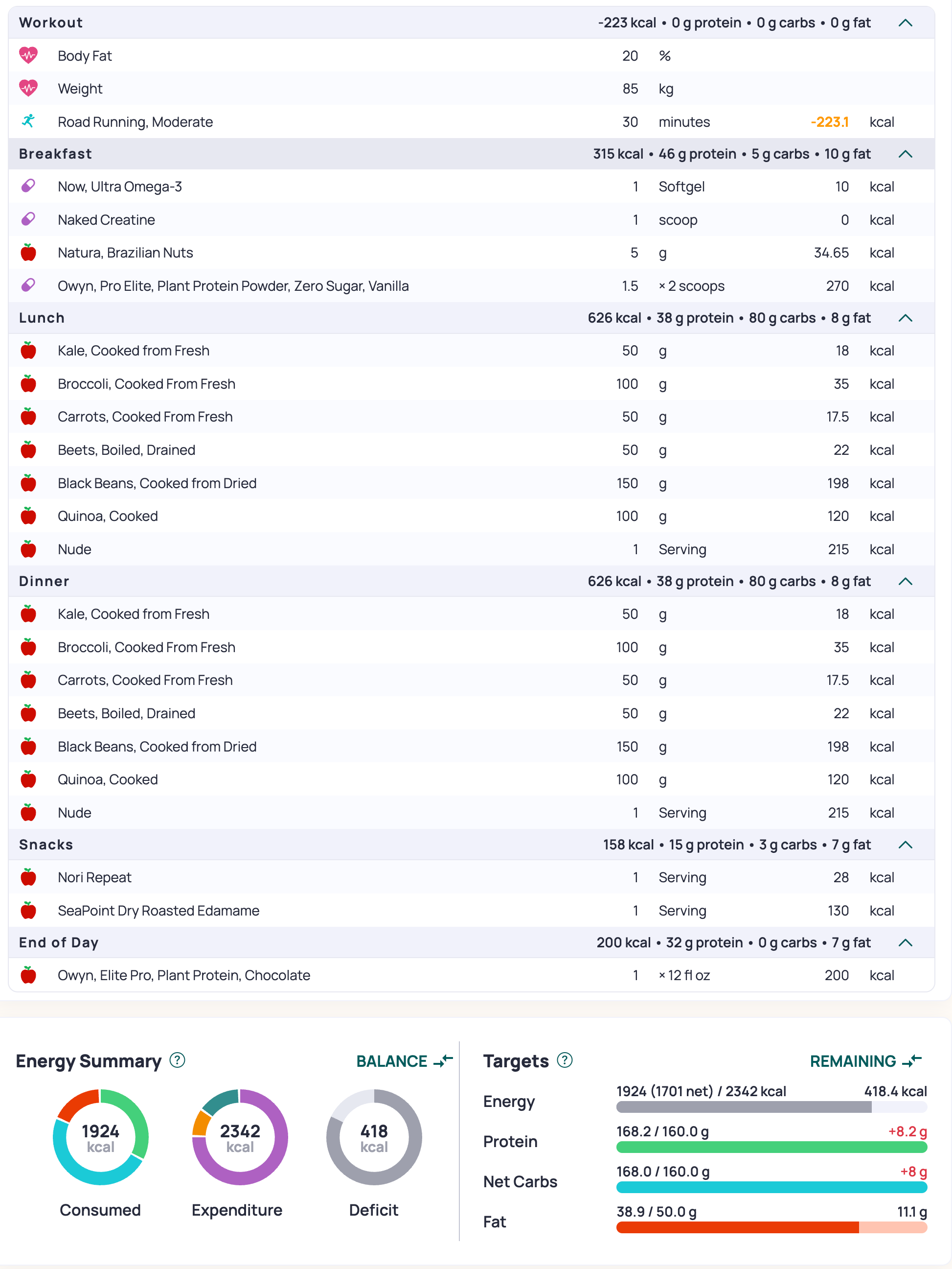 The next step is to template your daily diet in a tool like MyFitnessPal (I use a free tool called Cronometer), ensuring you hit your macros (carbs, protein, fat) and micros (vitamins, minerals).