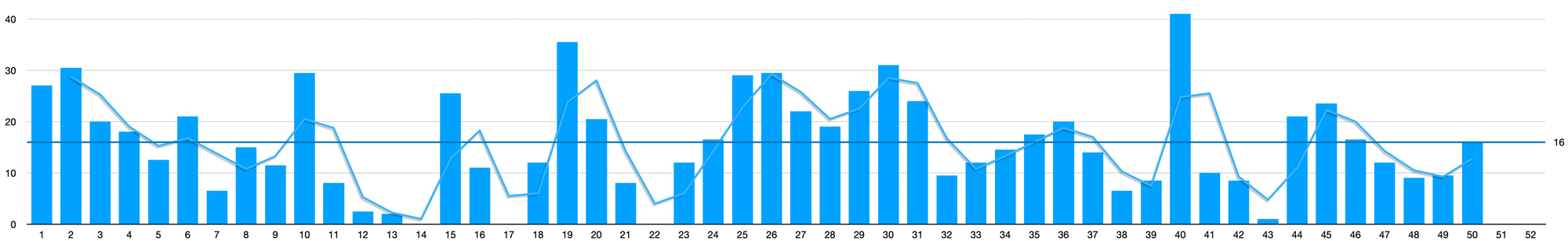 For example, here's a breakdown of a year in which I read 800 hours, an average of 16 hours a week.