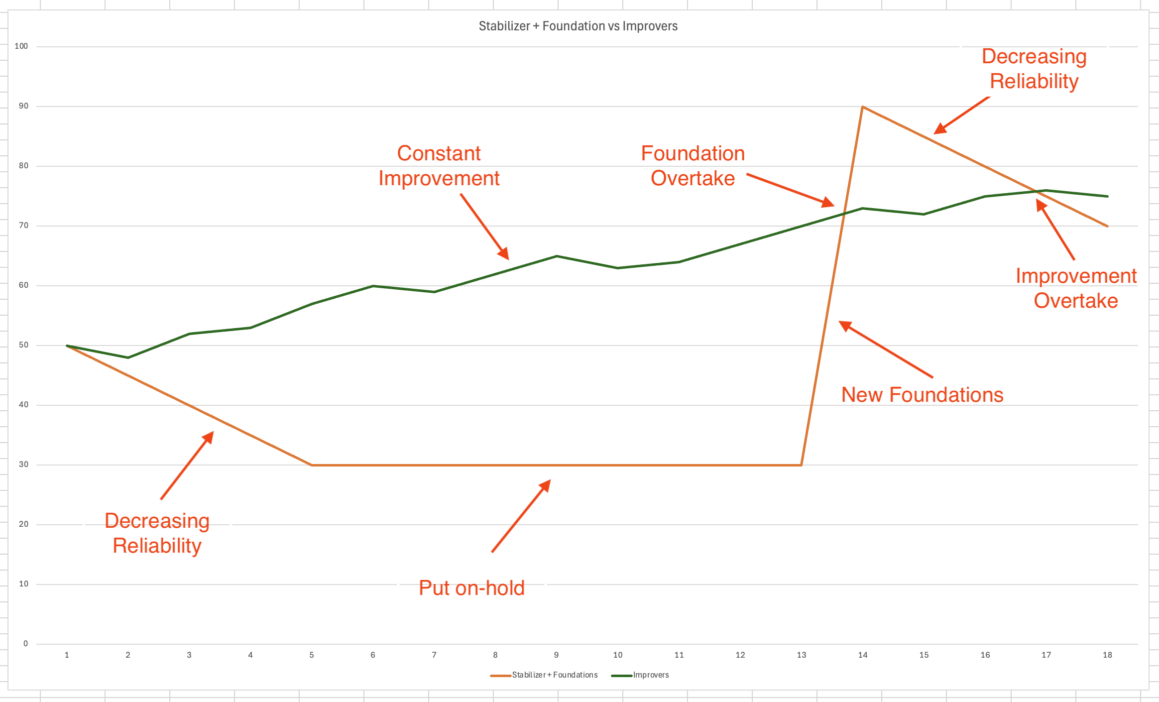 Reliability (y) over time (x) for Improvers (green) and Stabilizer + Foundations (red)