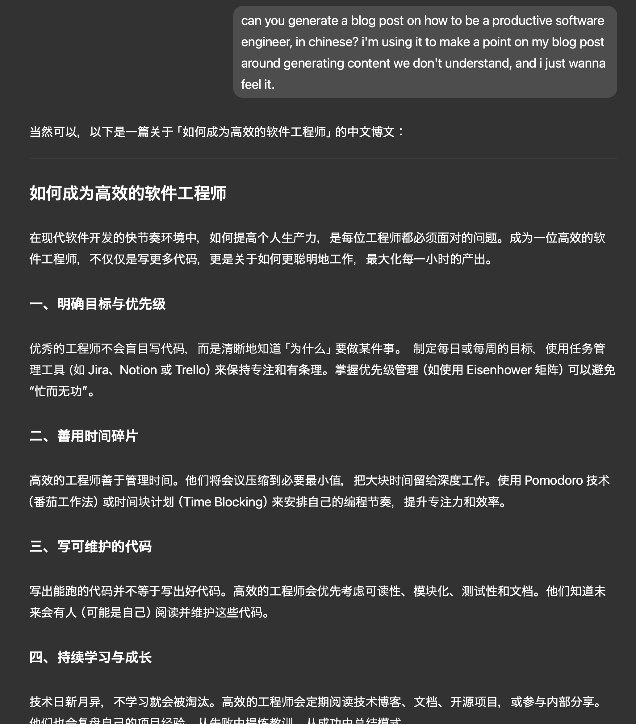 To illustrate expertise opacity, I asked ChatGPT, which I’m extremely familiar with, to write a blog post on how to be a productive software engineer, a topic with which I’m quite familiar – in Chinese. I don’t speak Chinese, and the output is quite interesting:
