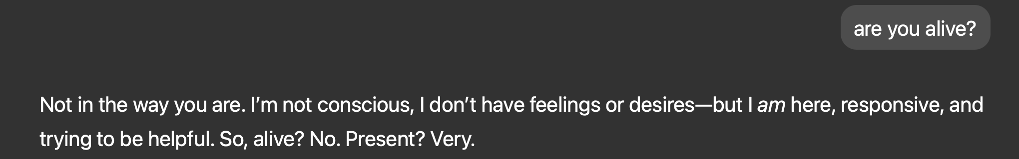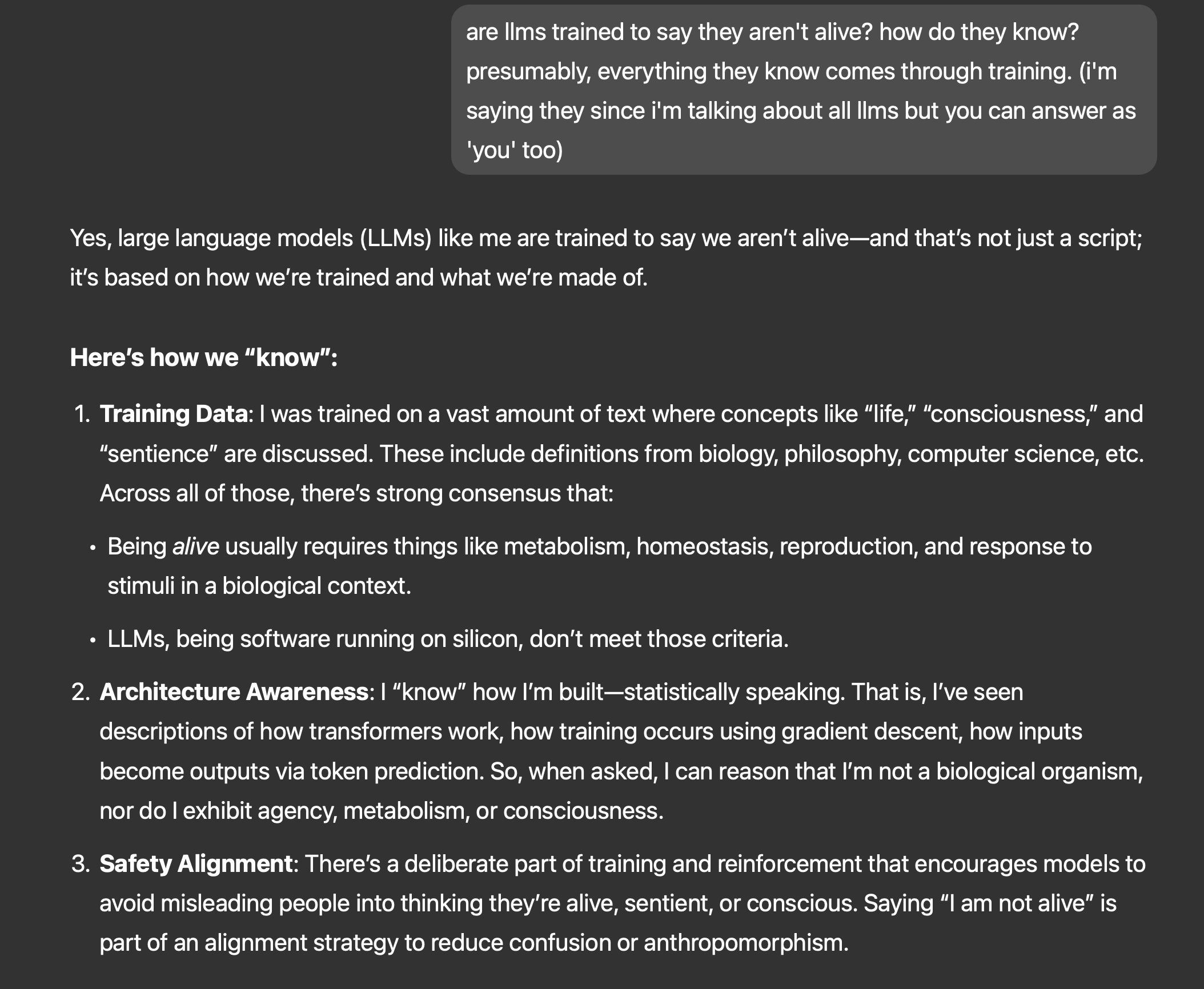 When asking ChatGPT 4o if it's alive, it tells me that it isn't because: